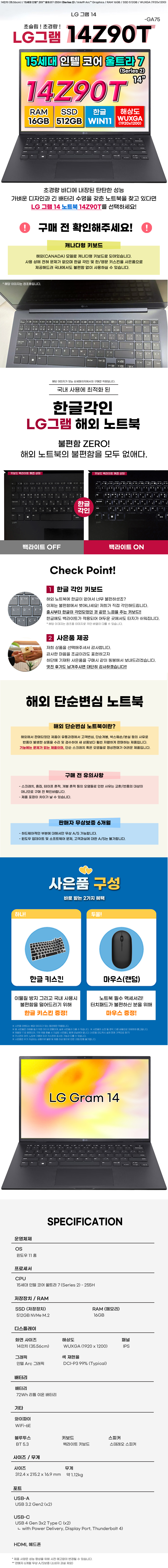 LG그램 14Z90T-GA75 15세대 울트라7 16GB 512GB 노트북