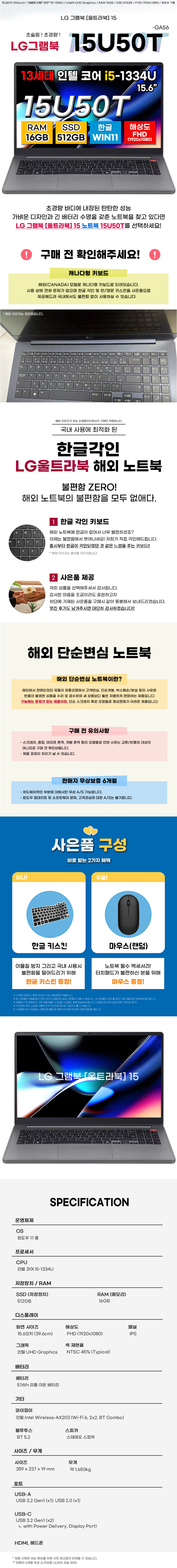 LG그램북 15U50T-GA56 15세대 i5 16GB 512GB 노트북